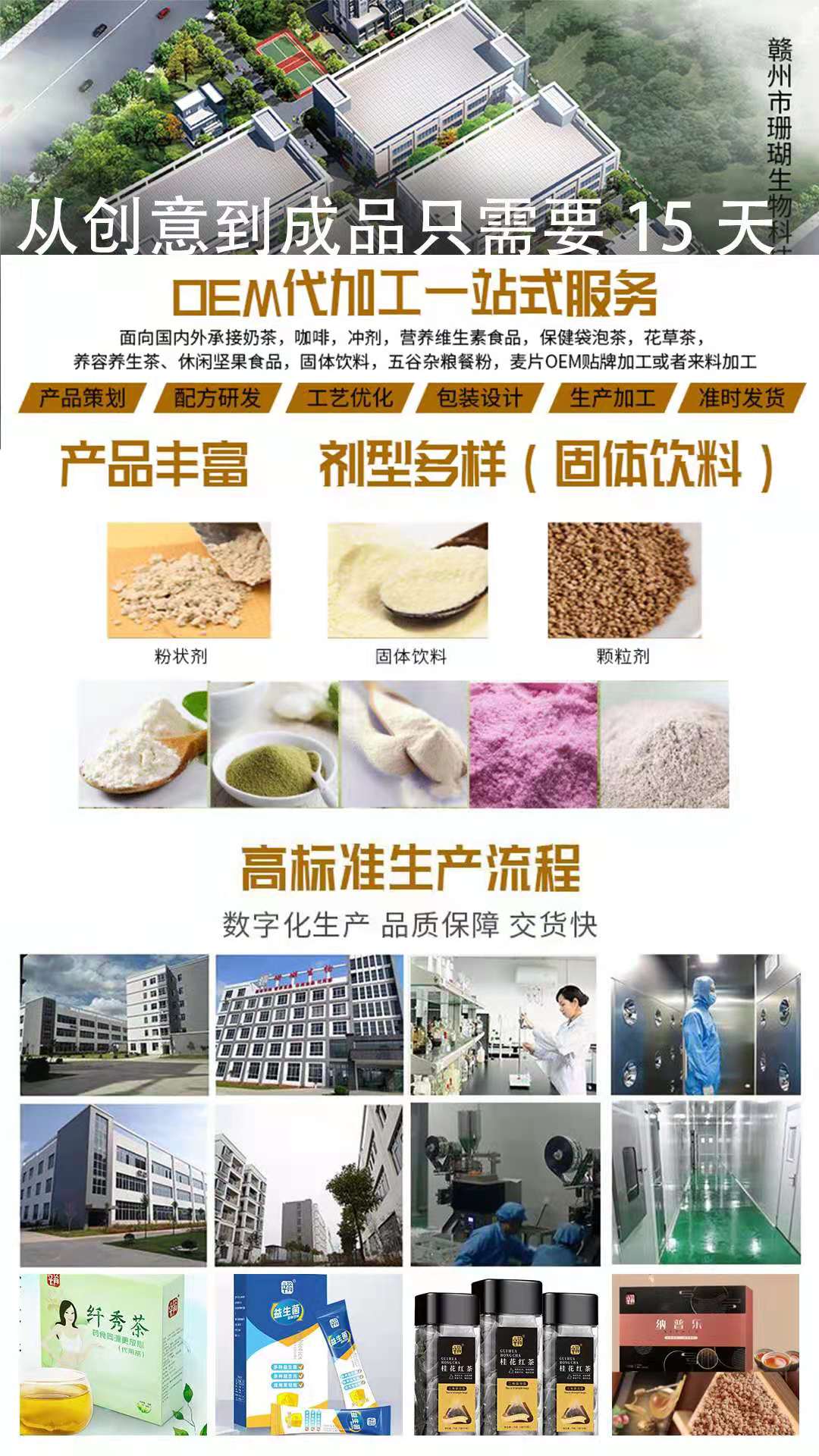 江西珊瑚生物科技有限公司面向國(guó)內(nèi)外承接固體飲料加工生產(chǎn),貼牌定奶茶,咖啡,沖劑,營(yíng)養(yǎng)維生素食品,袋泡茶,花草茶,,固體飲料,營(yíng)養(yǎng)餐粉,麥代片OEM貼牌加工或者來(lái)料加工,全程無(wú)塵車(chē)間,質(zhì)量保證,江西珊瑚生物科技有限公司旗下贛州珊瑚生物科技有限公司專(zhuān)業(yè)生產(chǎn)制造工廠,18年的生產(chǎn)研發(fā)生產(chǎn)一體化工廠,10萬(wàn)級(jí)凈化車(chē)間,專(zhuān)業(yè)固體飲料、功能食品、營(yíng)養(yǎng)食品生產(chǎn)制造。屬于高新技術(shù)企業(yè),國(guó)家行業(yè)標(biāo)準(zhǔn)起草單位之一,交貨及時(shí)全程保姆式服務(wù)為全國(guó)客戶(hù)提供貼牌定制,歡迎到工廠實(shí)體考察定制。歡迎全國(guó)有意者考察洽談合作。